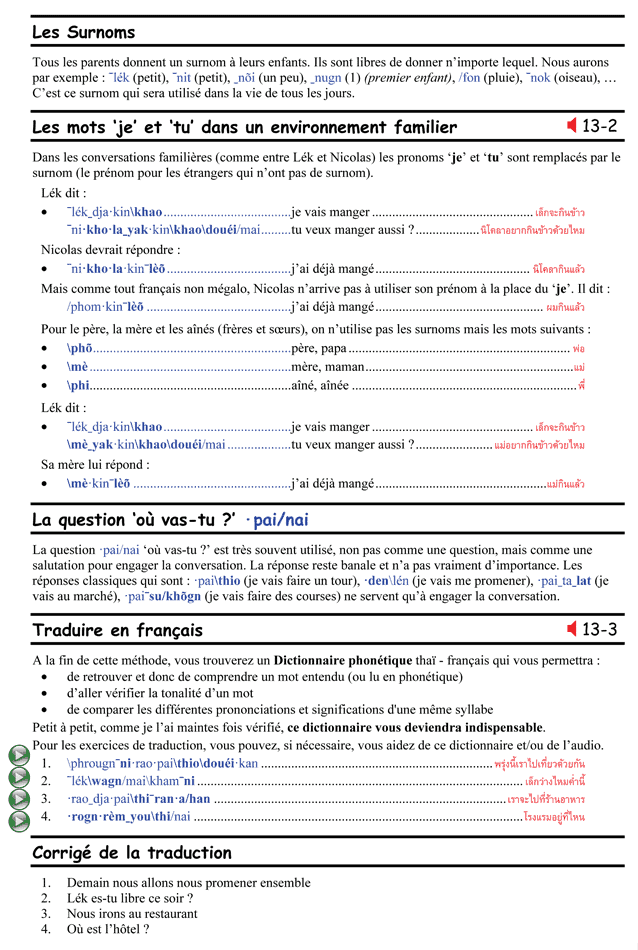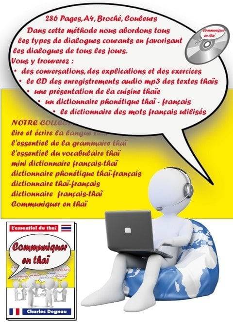 Et, en complément de cette méthode pour apprendre à parler thaï vous pouvez télécharger des livres d’apprentissage du vocabulaire, de la grammaire, de l’écriture thaï ainsi que des dictionnaires phonétiques  réalisés aussi par Charles Degnau et offert gratuitement au format PDF à cette adresse :