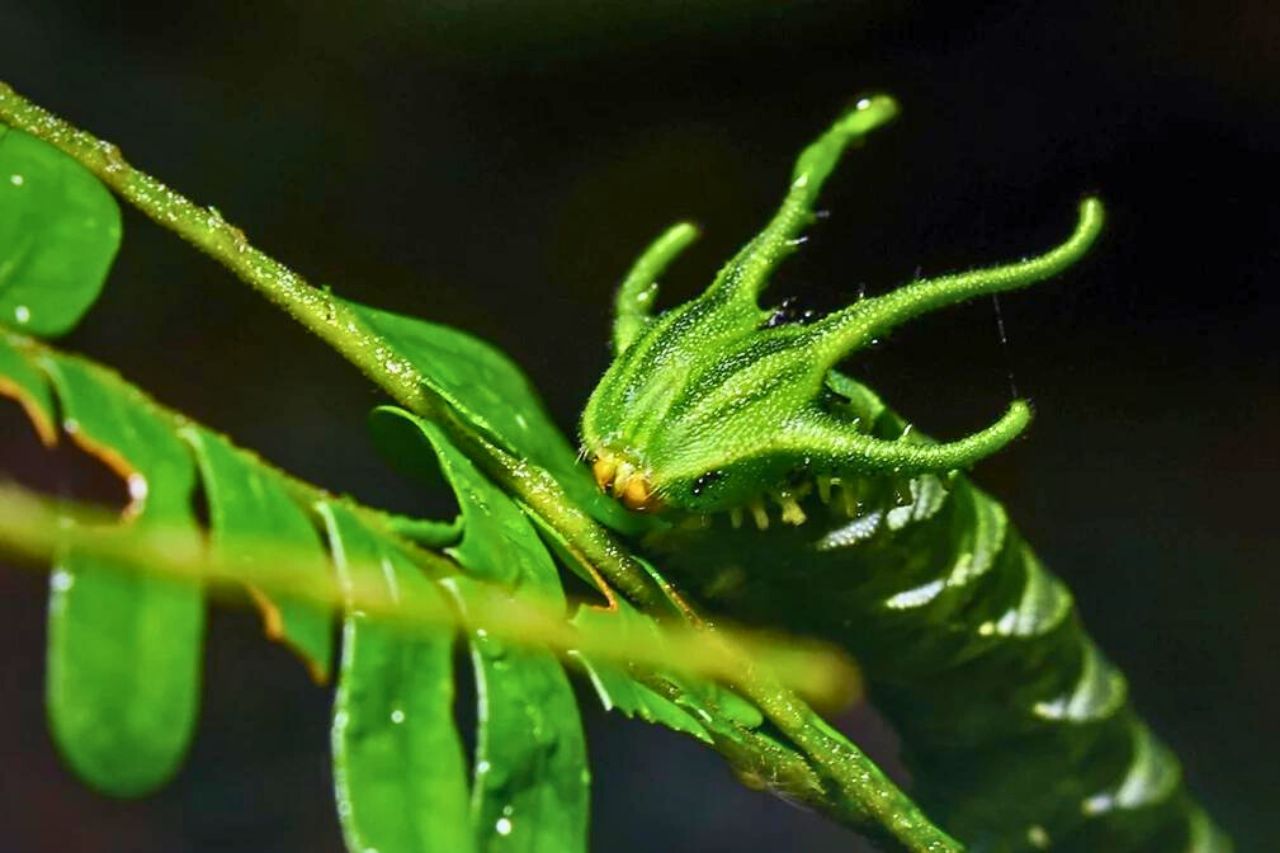La « chenille à tête de dragon » (Polyura athamas) a été découverte dans une plantation de mangoustans par un photographe qui visitait l’endroit pour enregistrer des oiseaux et d’autres animaux sauvages.
