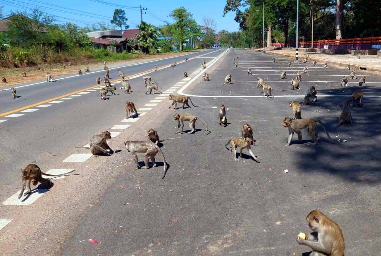 Des habitants du district de Pana ont raconté aux médias thaïlandais qu’environ 2 000 à 3 000 singes du parc forestier de Don Chao Puta sont venus en ville à la recherche de nourriture.