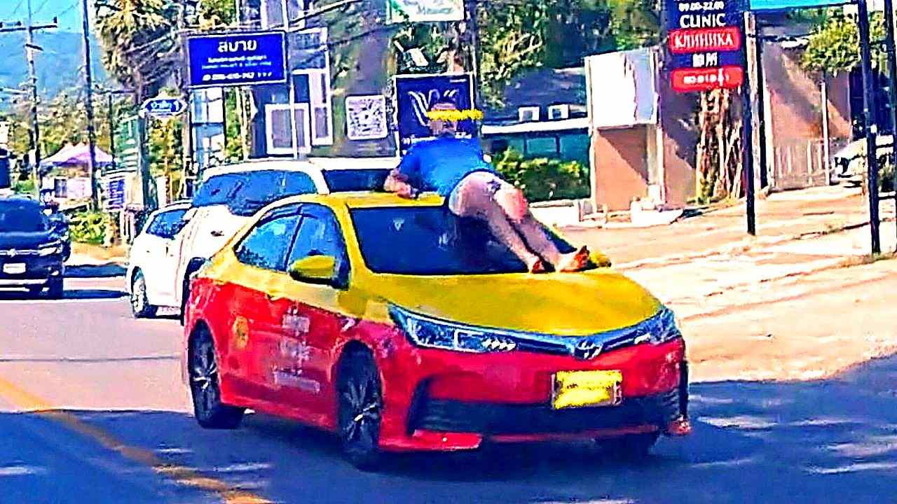 Touriste allongé sur le capot d’un taxi rouge et jaune à Phuket. Photo : The Phuket Express