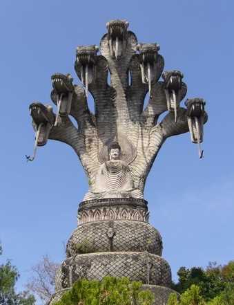 Muchalinda, le roi-nâga vivant dans l’arbre ou le lac, le suréleva ou l’entoura de sept anneaux et l’abrita de la pluie grâce à ses sept capuchons.