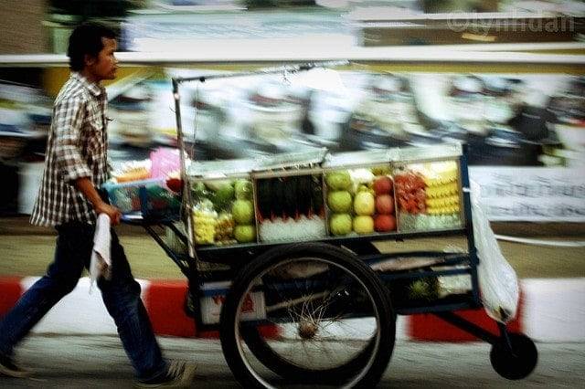 Et si vous n’avez pas envie de vous déplacer, vous n’aurez qu’à héler un marchand ambulant qui vous vendra les fruits choisis, découpés, en morceaux dans un sac plastique avec une pique en bois, pour une 20ᵉ de baht.