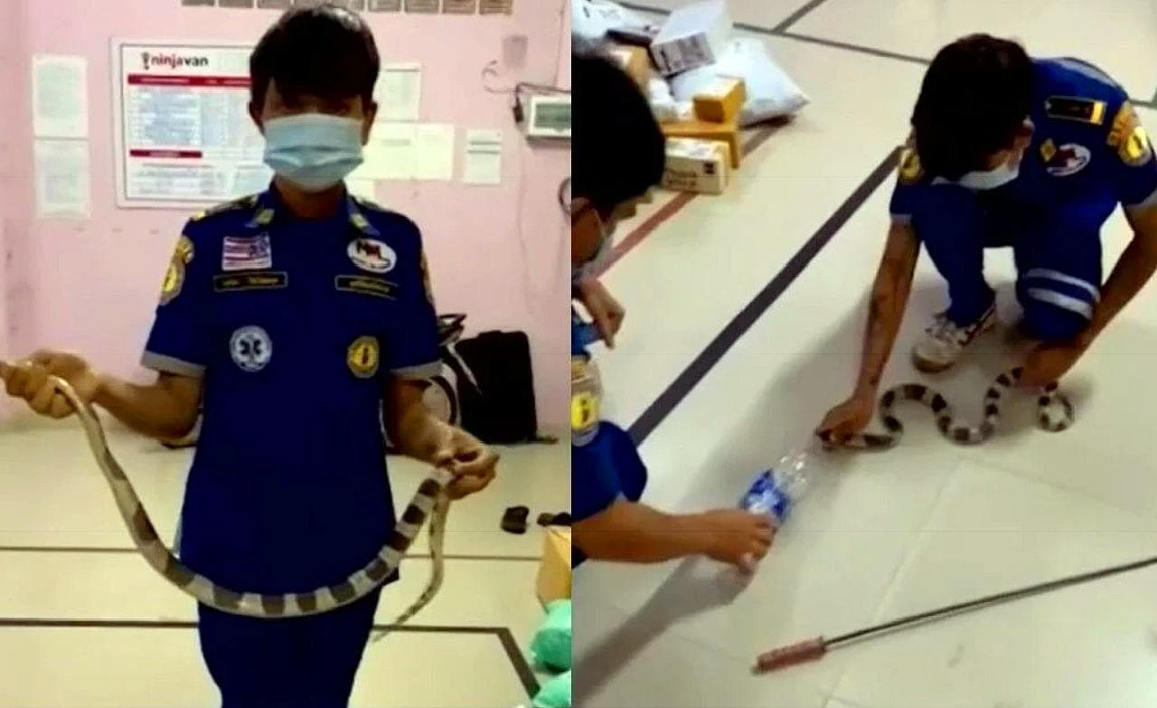 Le personnel a appelé une équipe de sauvetage de serpents de la Fondation Khun Rattanawut, qui est rapidement venue capturer le krait malaisien venimeux (Bongare candide), qu’elle a placé dans une bouteille en plastique.