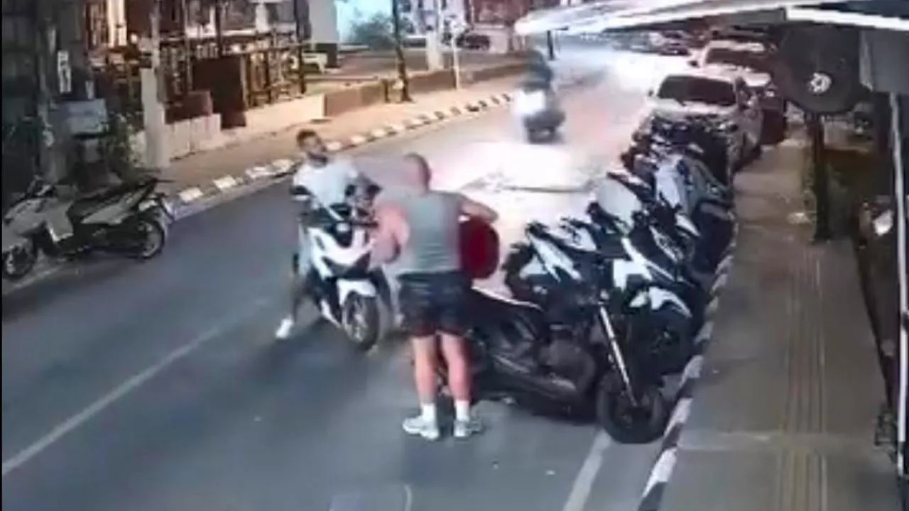 Les suspects repartent à scooter après s’être emparés d’une guitare laissée sur une moto stationnée dans le quartier de Karon, à Phuket, d’après les images de surveillance.